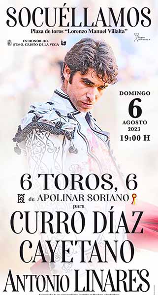 La corrida de toros se celebra el domingo 6 de agosto a las siete de la tarde. Los diestros Curro Díaz, Cayetano, y Antonio Linares, lidiarán seis toros de la ganadería de Apolinar Soriano.